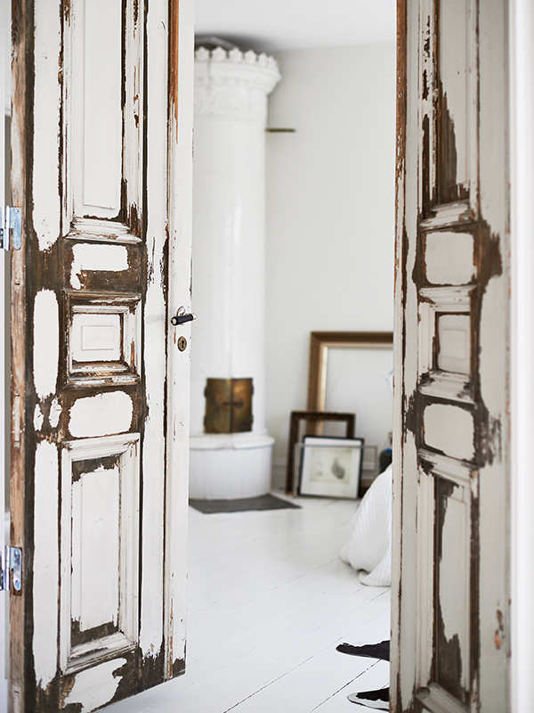 Solo hay un toque diferente que le da mucha personalidad a la vivienda....unas puertas de madera plafonada, en la que tras el blanco impoluto, sale la textura de la madera dándole fuerza e intensidad a una perspectiva diferente.