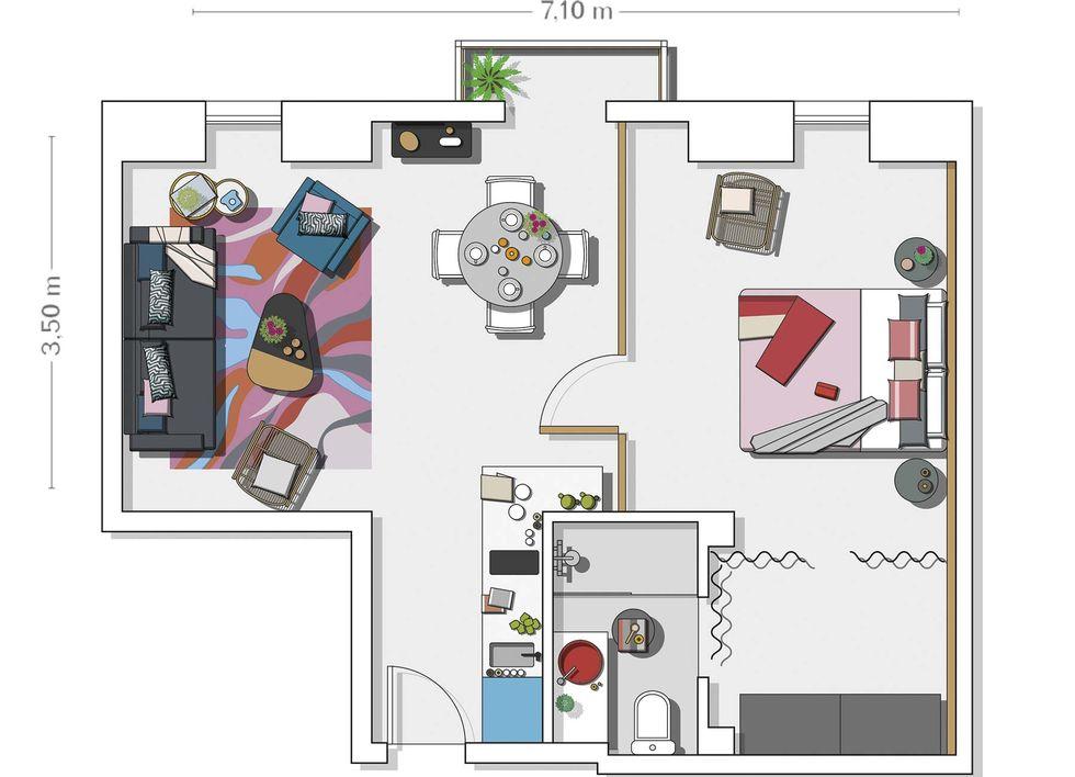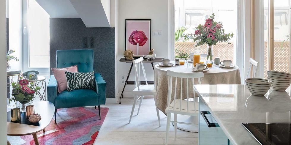 Con un techo abuhardillado y las paredes tapizadas, se trata de un interior cálido y luminoso, con estilo y colores vibrantes como acento. Pocos muebles, pero con buen diseño, y una alfombra a todo color, son suficientes para que este espacio de pocos metros resulte personal y derroche sofisticación.