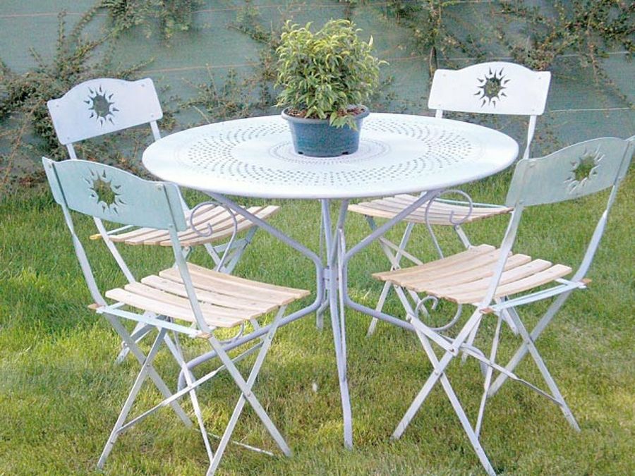 Los exteriores no son ajenos a la preocupación estética de la propietaria de la casa. El jardín es un rincón de ensueño y, para demostrarlo, sirve de muestra este conjunto de mesa y sillas en forja azulada. ¿Os apetece un tentempié al aire libre? La anfitriona nos invita con mucho gusto.