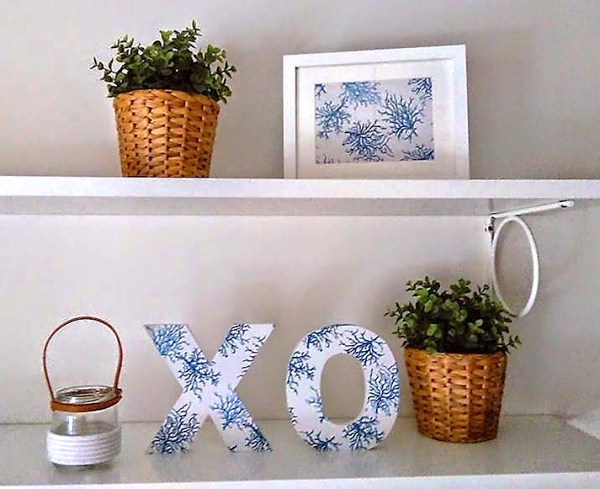 Para completar la decoración coloqué una servilleta con el mismo dibujo de algas en un marco de fotos y agregué unos cestillos de rattán con unas pequeñas plantas en la decoración, el mimbre y rattán también me evocan al verano.