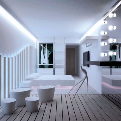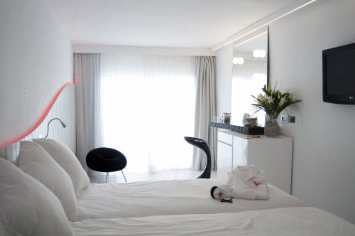 Las habitaciones si que tienen una temática minimalista y presentan cromoterapia con luces LED, aromaterapia y cortinas oscuras para adaptarse a tu al estado de ánimo. Todas con vistas al mar jardines o la piscina central. Si tengo que escoger un rincón me quedo con la terraza situada en