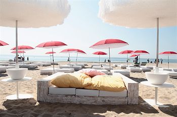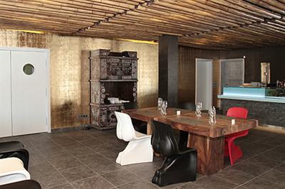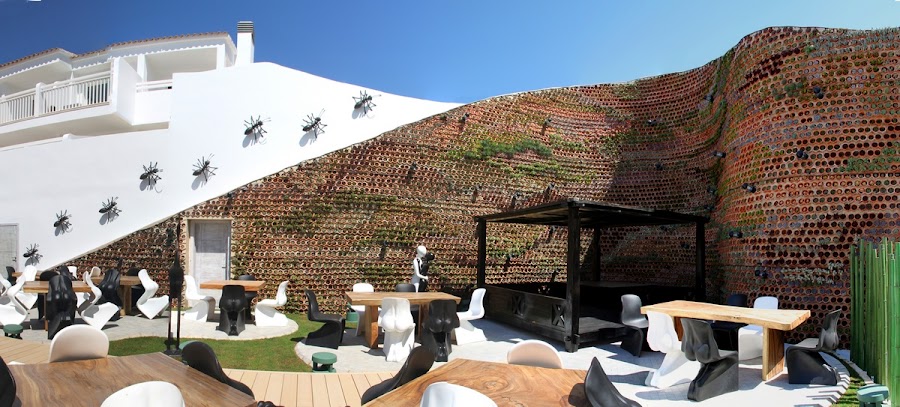 Lo que realmente me impacta salvando mi rincón favorito es la monumental cabina de DJ flanqueada por un arco de madera colosal que es el centro literal y espiritual del hotel, la vista del DJ ha sido elevada para poder ver toda la pista de baile y la piscina, muy cerca de ella se colocaron unos magníficos jardines verticales que además de decorar sirven como elemento acústico. Están construidos con unos elementos cerámicos en forma de botelleros los cuales tienen una ligera inclinación que permite la absorción del agua de la lluvia, os dejo el link de Urbanarbolismo el estudio de arquitectura y urbanismo que los diseño y por cierto tienen cosas muy interesantes.