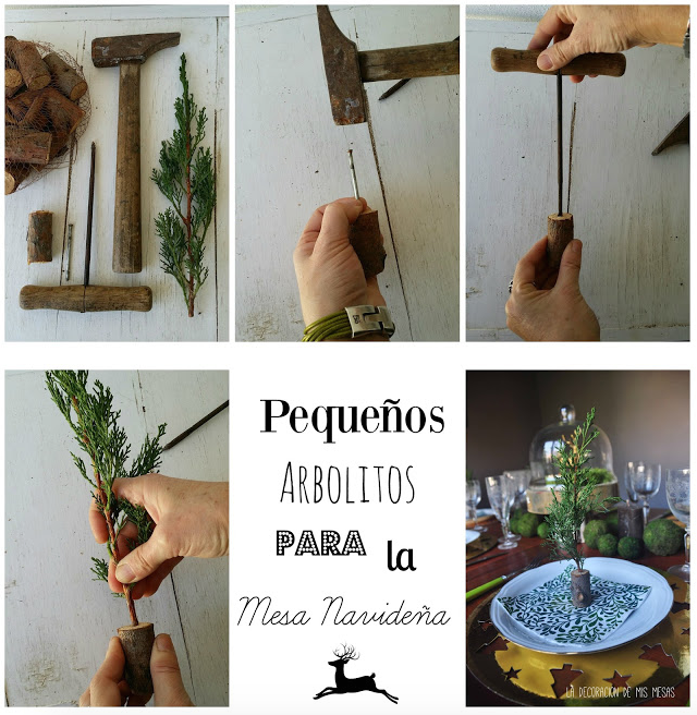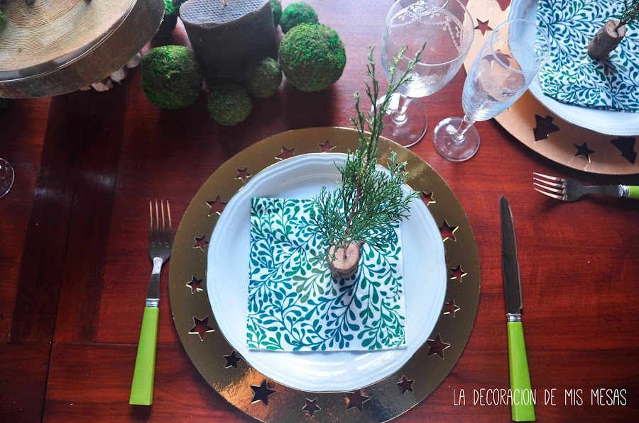 Una vez estaba planteada la mesa, pensé en poner algún tipo de marca sitios o decoración individual por comensal y así surgieron estos arbolitos hechos de ramas de cipreses "robadas" de la casa de mi vecino (bueno robar... robar tampoco, que dan para mi casa, pero ¡me alegro que no lea este blog!.