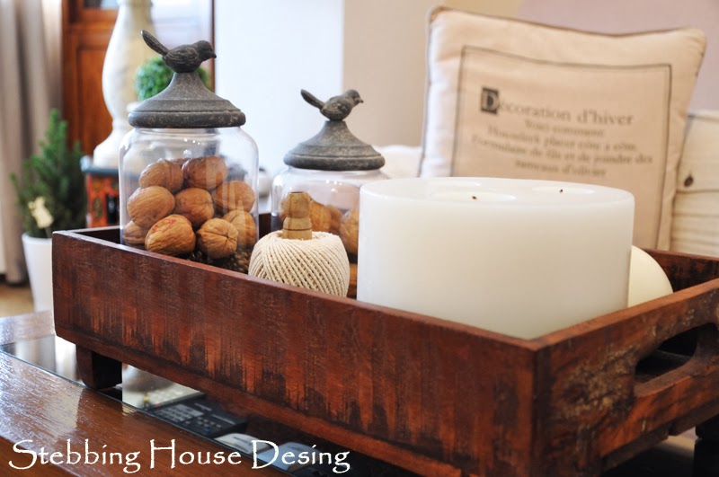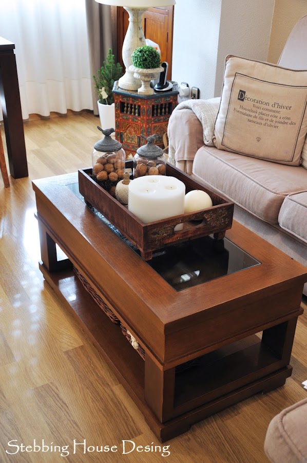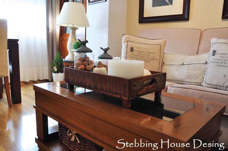 Elegí una bandeja desgastada, así alta y que de paso tuviera bastante cabida, y ya es solo cuestión de ir decorándola con pequeños detalles como velas, tarros, etc..
