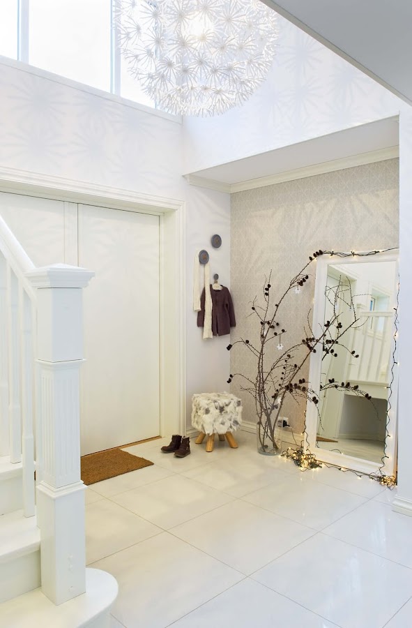 Pero no sólo este espacio común está preparado para recibir la navidad... Todas y cada una de las estancias de la casa están listas para vivir la navidad, empezando por el exterior de la casa, y el recibidor decorado con unas sencillas ramas llenas de piñas naturales ¿Alguien sabe de qué tipo de pino podemos conseguir estas ramas?