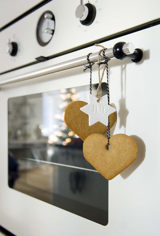 La cocina, es probablemente uno de los lugares en los que más tiempo pasamos durante estas fechas... ¿Qué sería de estas fiestas sin sus dulces, postres navideños y recetas caseras? Una pequeñas guirnalda de galletas de jengibre como las que usamos en uno de estos servilleteros, y unos colgantes con ramas son suficientes para completar la decoración navideña escandinava de esta vivienda ¿Pensáis que se necesita más?