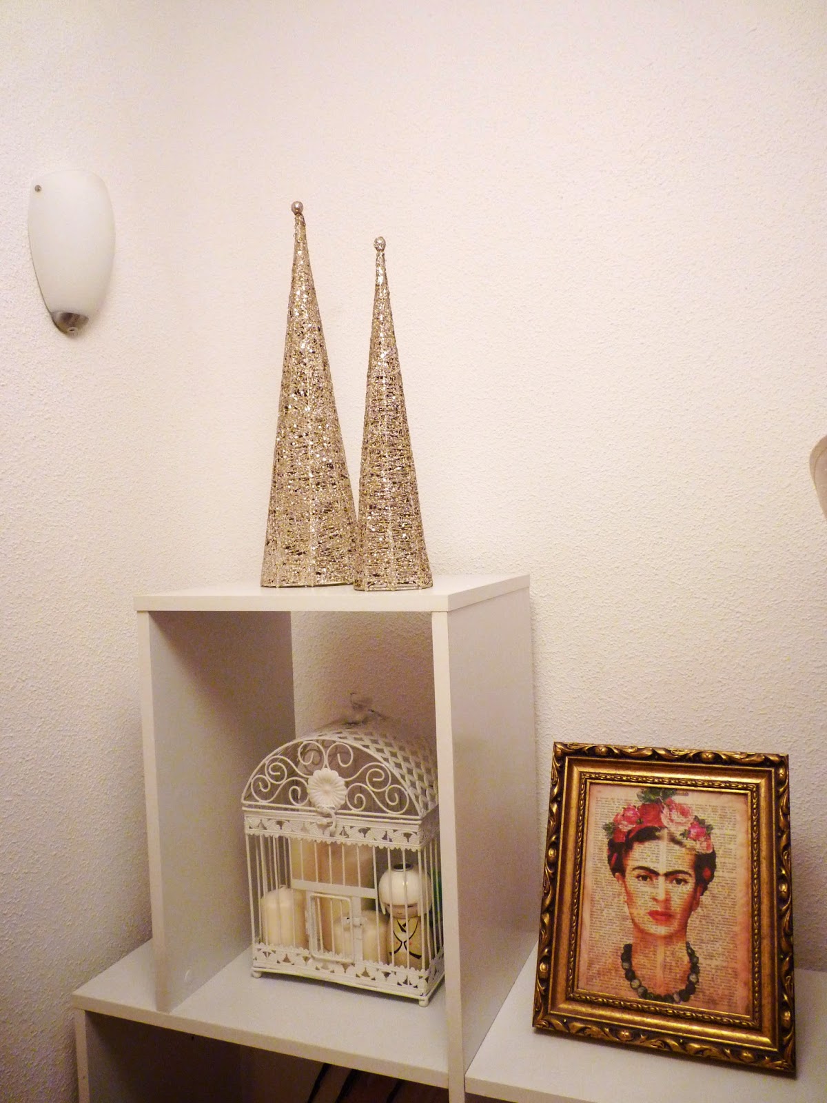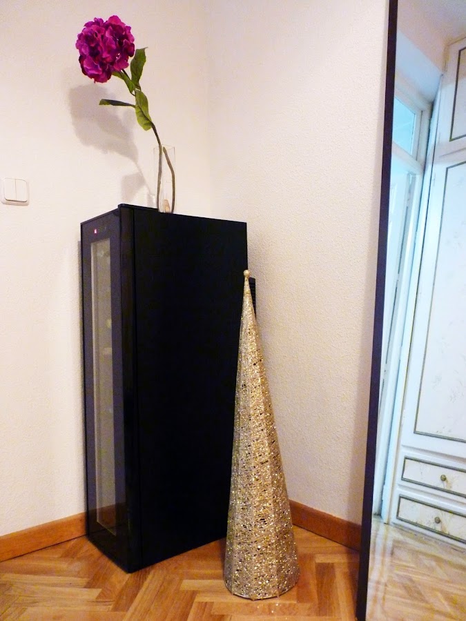 Por ejemplo, en este mueble del hall he colocado estos conos de purpurina en sustitución del árbol de Navidad. El fin de semana estuve en Leroy Merlin y tuve con ellos un auténtico flechazo. Y tanto me gustaron que me los compré en 3 tamaños (¡viva el consumismo!). El tercero y más grande lo he colocado en este rinconcito de un pasillo de mi casa entre la cava de vinos y un espejo donde me miro cada mañana (las casas pequeñas son lo que tienen).