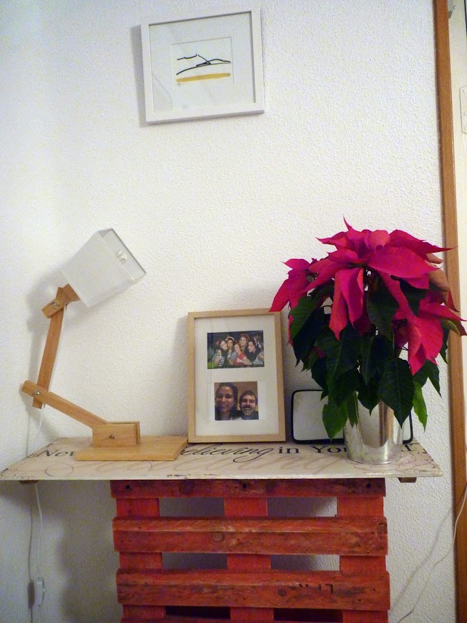 Por supuesto, y más en una casa como la mía en la que siempre hay flores, no podía faltar una flor de pascua, con ese color rojo que da tanta vida. La he colocado en este rincón DIY que construí con un palé rojo y una tabla de madera con un mensaje positivo que compré también en Leroy Merlin.
