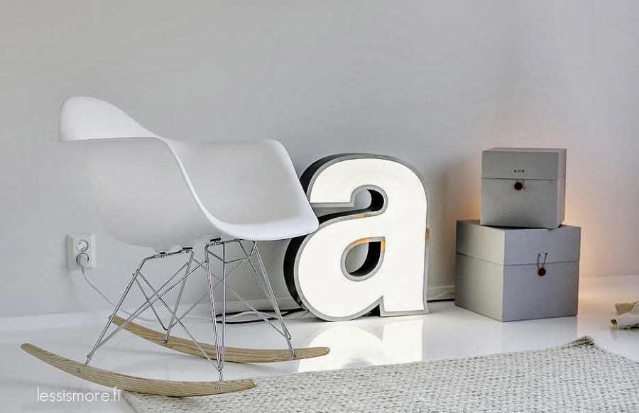 El dormitorio infantil, sin lugar a dudas es mi espacio favorito, limpio, sereno y a la vez delicado. Posee piezas maravillosas como la tienda la mecedora Eames y una letra iluminada realmente fantástica.