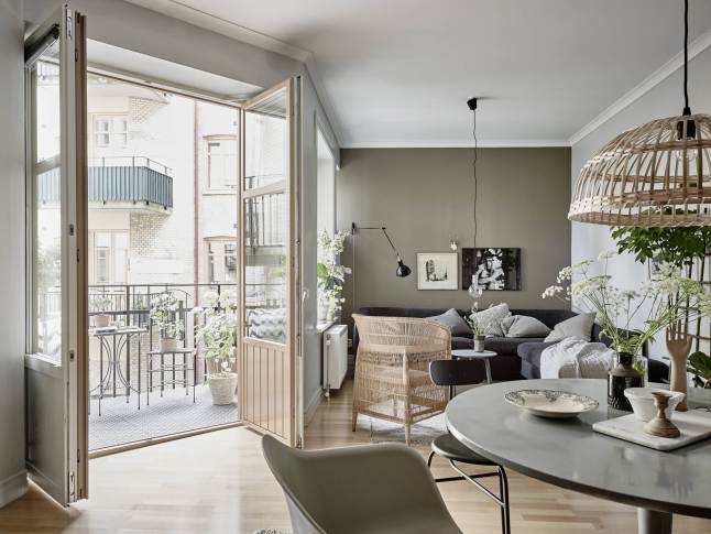 Pero sin duda si hay algo que me gusta de esta vivienda son las piezas de mobiliario en madera clara, rattán y fibras naturales. Su combinación con los grises y plantas, me parece todo un acierto, siempre aportan esa calidez que necesita el diseño nórdico para dejar la frialdad típica de su decoración. Aunque como ya os conté en este post, la decoración cada país escandinavo tiene sus propias características.
