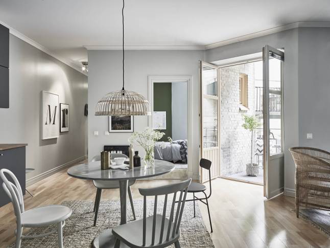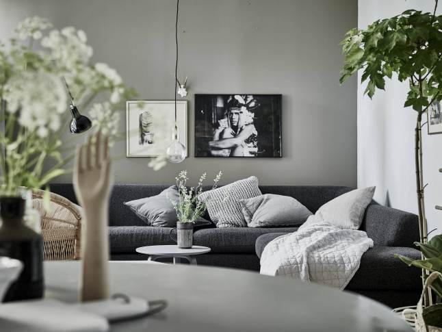 Aunque bien es cierto que esta vivienda Sueca de 76m2 esta decorada en tonos neutros, como la mayor parte del estilo nórdico, los grises en diferentes gamas no se presentan en pinceladas, sino en grandes masas, lo que crea mas dinamismo y carácter. (Fijaros en la pared del salón,el sofá o el mobiliario de cocina)