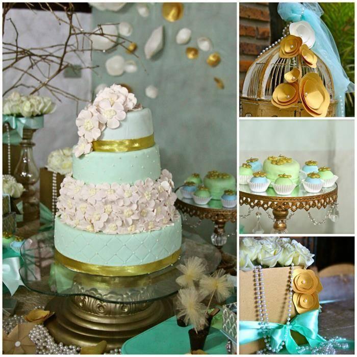 Para decoraciones un poco mas rústicas o vintage te recomiendo que acompañes el azul de colores opacos y colores metalizados como el dorado que observamos aquí. Queda a la perfección y ayuda a la torta a que se note mucho mas su hermosura. Y no solo esto, también puedes usar jaulas decorativas.
