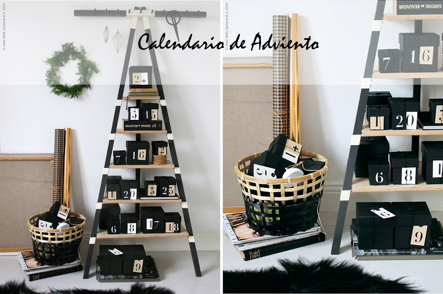 Ahora le toca el turno al calendario de Adviento en moderno estilo escandinavo. Sencillo y efectista, esta creado sobre la estantería PS 2014 de Ikea, sobre la cual se han colocado cajas de regalo en color negro y etiquetas con números. Como verás una manera muy fácil de crear un calendario de Adviento, aún estas a tiempo para crear el tuyo.