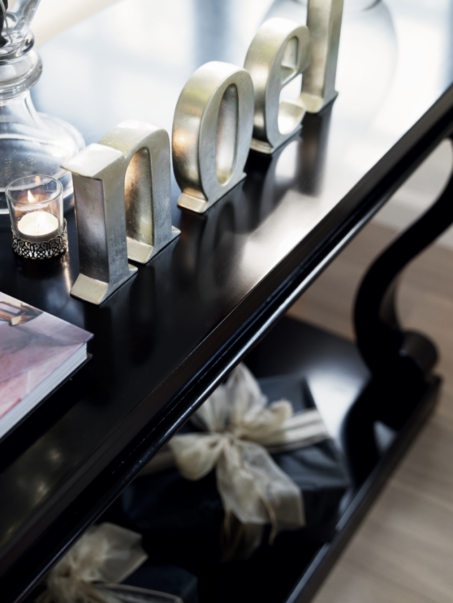 Una casa danesa que además de usar el binomio de color blanco y negro introduce escasos detalles en brillos dorados, plateados o de cristal, para decorar la mesa de comedor. Unos mínimos guiños que rompen timidamente con la monocromía y que resaltan gracias al contraste creado sobre el fondo negro del mantel.