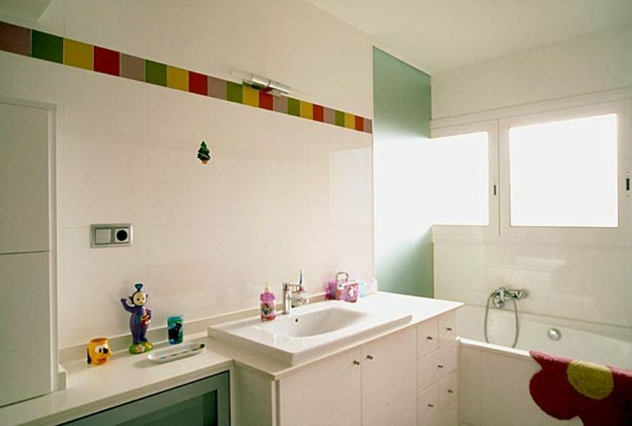 Para el cuarto de baño de los pequeños de la casa también se ha elegido como predominante el blanco, con toques de color, rompiendo así con la uniformidad general y dando vida al espacio.