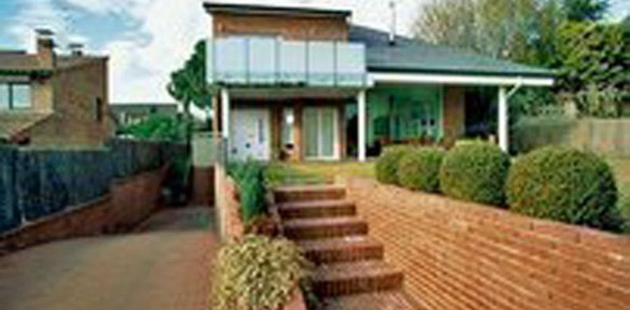 Vista exterior de esta casa, construida con obra vista y perfilería de aluminio blanco. La puerta de entrada por la parte exterior esta acabada en lacado blanco y por el interior en cerezo barnizado. Los jardines se trataron con gran delicadeza, para no estropear las vistas desde el interior. En la parte trasera se diseñó un jardín japonés para poder disfrutarlo desde el despacho.