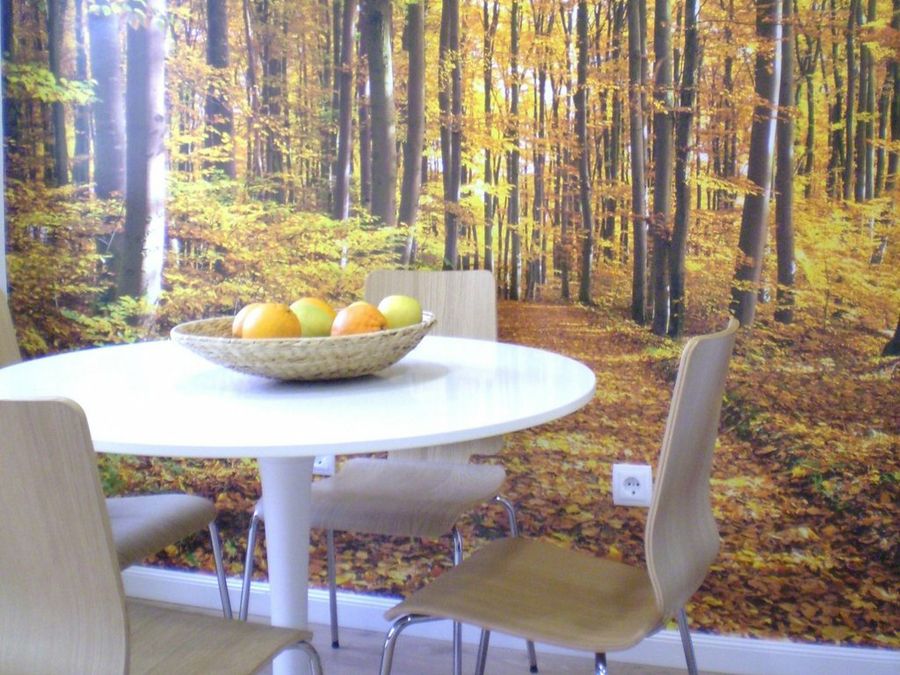 La cocina en blanco da una gran sensación de espacio y orden. Vemos como se ha pintado la parte superior de la misma y se ha elegido un suelo de imitacion madera para dar más calidez. En la zona del office, además de la mesa Tulip que siempre otorga personalidad, el gran mural nos recuerda la constante mezcla entre decoración y naturalidad que se respira en la casa.