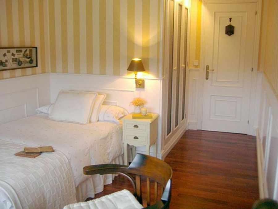 Los hijos de Celia ya son mayores y pasan el tiempo justo en casa. La alcoba de Edy, el hijo mayor, luce un zócalo blanco con molduras y un papel de Laura Ashley con franjas beige. La estrella del cuarto es un gran armario del siglo XIX. El buró es de Acevedo y la cama muestra una funda nórdica y cubrecanapé de Bassols, una colcha de Sandra Marqués y unos cuadrantes de Zara Home.