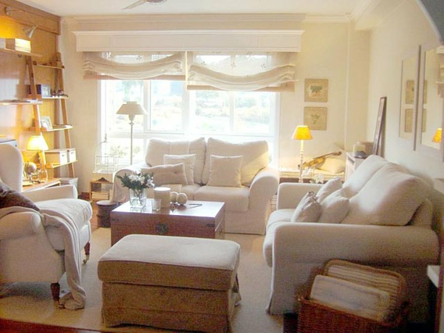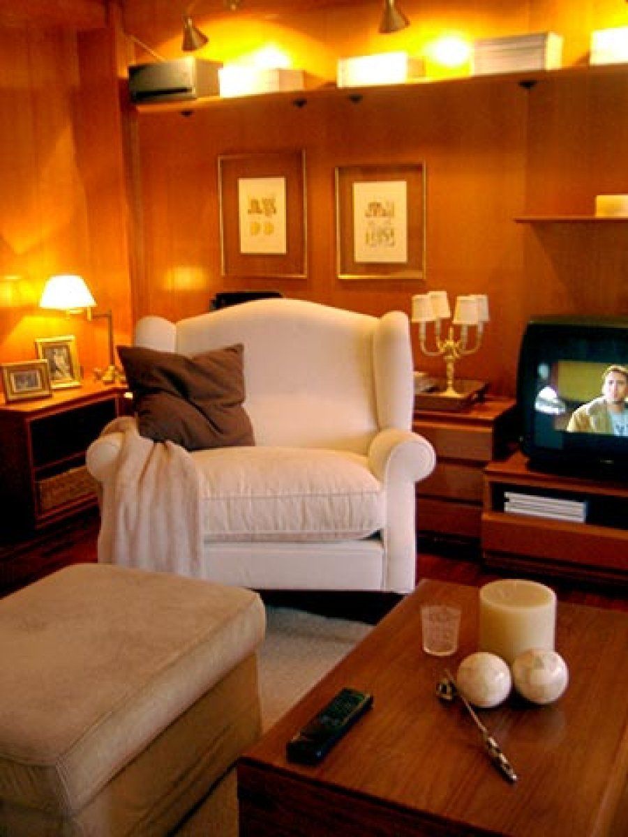 El punto fuerte de la decoración está en el color: linos de tonos claros y cálidos en los sofás comprados en El Corte Inglés y unas alfombras grandes de KP para delimitar las estancias. En palabras de Celia: "he intentado crear una atmósfera acogedora con lámparas auxiliares por todas las esquinas e iluminando una balda que tenemos en todo el perímetro del salón con unos apliques".