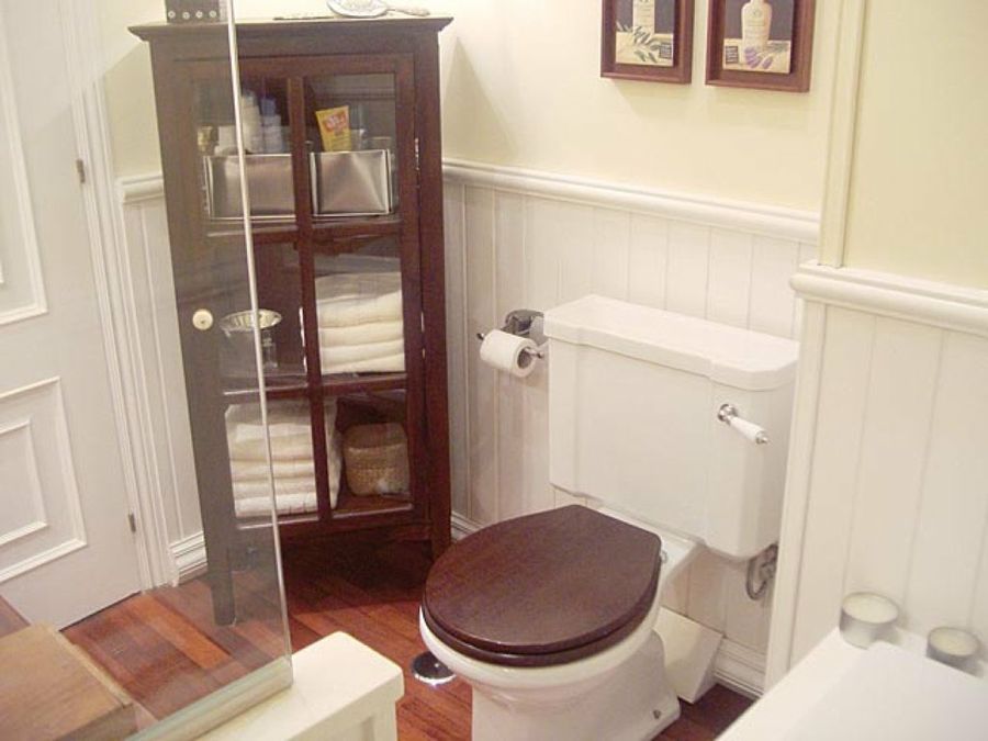 Tanto en el baño de cortesía como en el principal, la dueña aplicó la misma filosofía que en la cocina: "tapamos todos los azulejos con un arrimadero de madera lacado blanco y dispusimos encimeras de madera". En el de invitados es de teca, mientras que en el de la habitación principal es de ipé, la grifería es de bronce de aire retro y la bañera fue sustituida por una ducha de obra.