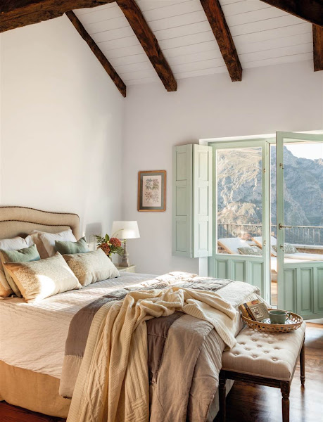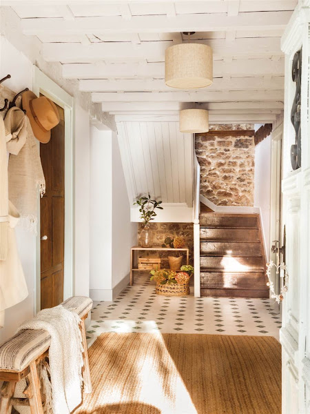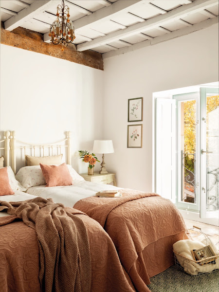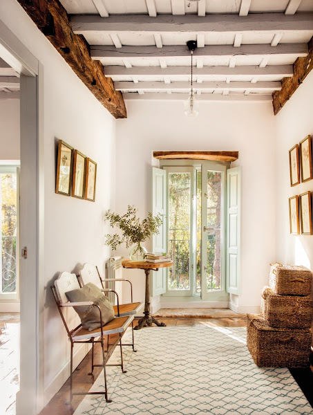 Si tienes la suerte de tener las vigas del techo al aire ni se te ocurra taparlas, puedes optar por pintar una parte y dejar la madera original en la parte saliente, o directamente un poco de barniz y dejarlas tal y como están. En esta casa han optado por diferentes opciones dependiendo de la sala pero tengo que decir que yo sería de las que las dejaría a la vista y sin pintar.
