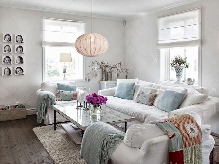 Si lo que quieres es un extra de calidez en tu salón, tu estilo es el nórdico o el boho Chic y tus tapizados chenillas o terciopelos. El color principal es el blanco y para los detalles (cojines y mantas) utiliza colores como tostados, pastel, lilas. Aquí te dejo estas fotografías para que te inspires.