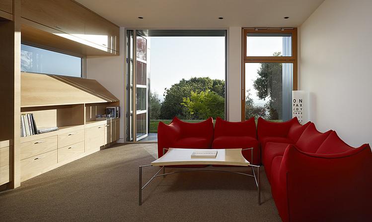 Si tu salón tiene mucha luz, atrévete con colores con más vida, como por ejemplo, este rojo. Aquí, combinado con muebles en color roble.