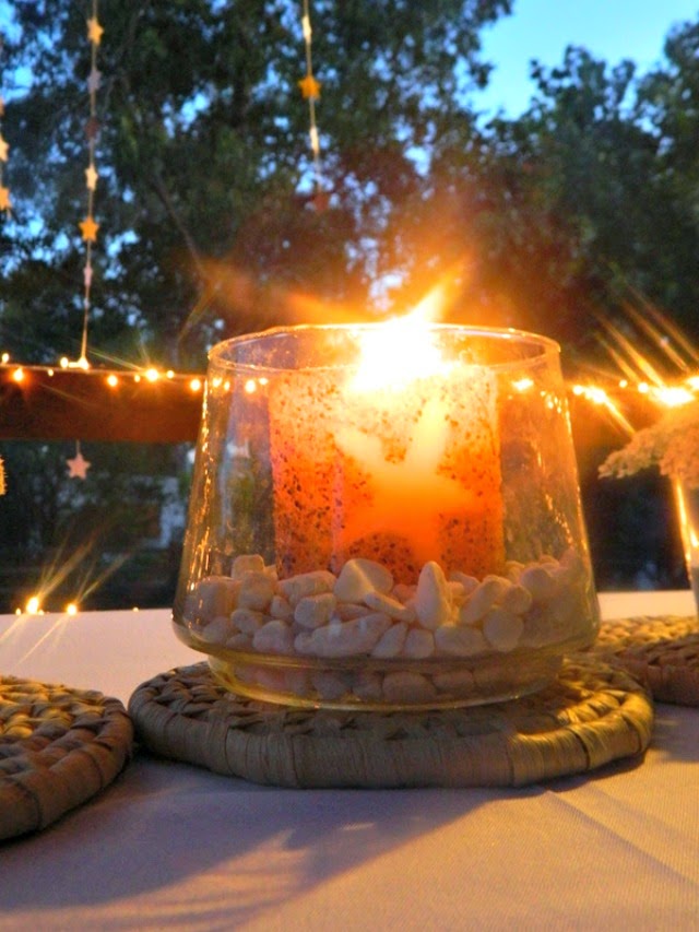 Obviamente no podían faltar las luces de navidad. Me gustan de forma desmesurada las guirnaldas de luces y las he usado en proyectos que nada tienen que ver con la navidad. Ya confesé sin reparos que las uso durante todo el año. Sin embargo, tengo mis limitaciones estéticas en este terreno. Siempre elijo las luces de arroz con el cable menos llamativo que sea posible. Entre la gran variedad de propuestas comerciales, hay de todos los tamaños, colores y formas imaginables. Mis preferidas siguen siendo las clásicas luces blancas y con ellas adornamos la baranda de madera de la pérgola que reciclamos el diciembre pasado. También hice un símbolo de la paz para Camilo, que sigue en modo hippie desde la fiesta de fin de curso del jardín, para la cual se disfrazó al mejor estilo Lennon. Nada más, toda nuestra decoración fue reciclada o hecha a mano.