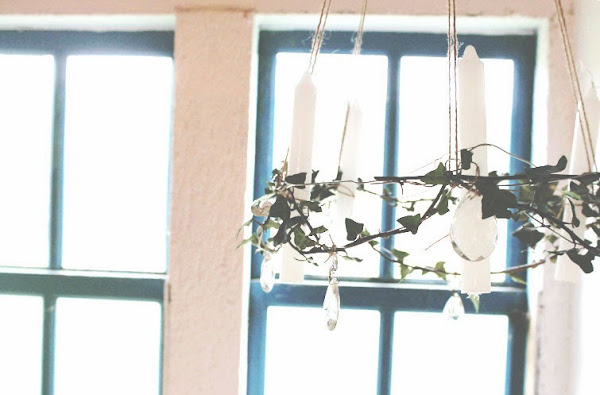 También nos encantó darle forma a la idea de crear un especie de lámpara con hiedra, cristales y velas. Habíamos visto alguna en pinterest y nos animamos! es otro DIY muy fácil, porque la base es un alambre al que damos forma circular, dejando hueco para las velas, y sobre el que enrollamos las tiras de hojas naturales. Eso sí, lo colgamos con cordón, y os aseguramos que no es lo más recomendable a la hora de encender las velas (qué peligro!). Hubiera quedado perfecto con cuatro hilos más finos también de alambre!