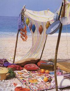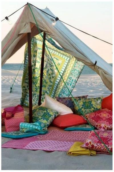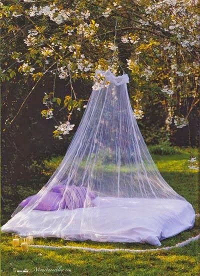 Los materiales empleados no pueden ser más fáciles de conseguir, solo necesitas cuerda, palos de madera y telas y podrás disponer un dosel rodeando un banco, unos cojines, una manta... El diseño puede realizarse de distintas formas, cuadrado, rectangular, triangular... puedes meter cada mástil en un macetero sino puedes fijar la estructura al suelo, o atar cuerdas de un árbol a otro y crear distintos espacios mejor incluso que las imágenes que os dejo.