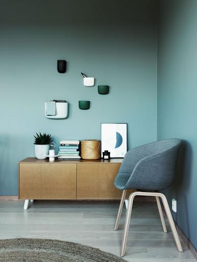 En esta vivienda, el verde claro de las paredes solo ha sido usado en las paredes. Un verde que claro, neutro y combinable con tonos naturales como la madera, el mimbre y la gama de los grises. Sólo con pintar las paredes de verde habrías conseguido un ambiente que trasmitiera los valores del color verde: tranquilidad, armonía, equilibrio… Pero si sigues las premisas de la decoración de esta vivienda vas a conseguir reforzarlo mucho más. El verde intenso del sofá también lo ha llevado al resto de la decoración a través de complementos decorativos, como las botellas de vidrios, los cojines y los recipientes de la pared. También a través de las plantas, con mucho protagonismo en esta vivienda pero con doble función. Si te fijas todas tienen el mismo color de hoja, todas con la misma función, aportar el verde intenso a la decoración. Y por último, el verde intenso en alguna de las sillas.