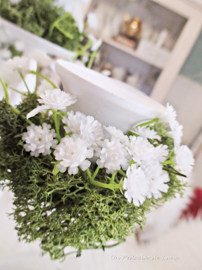 Así, poco a poco, fuí enlazando las florecillas con el musgo, nada fijo, para poder cambiarlo cuando me apetezca.