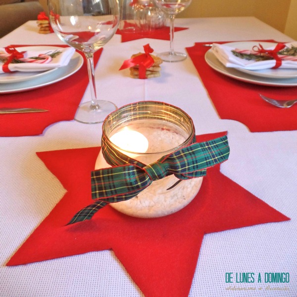 No sería real ni mucho menos práctico abarrotar la zona central de la mesa con una decoración muy poblada. El toque de color rojo de la estrella sobre el que descansa un punto de luz será más que suficiente. Además, nos permitirá cenar cómodamente sin molestarnos a la vez de nos aporte ese puntito de confort y calidez que tan bien sienta a nuestras casas estos días. Como ves, no es más que un tarro de cristal que reutilizamos. En su interior, piedra blanca decorativa, agua, y sobre ésta, una vela flotante. Un lazo en la boca del tarro ¡y hecho!