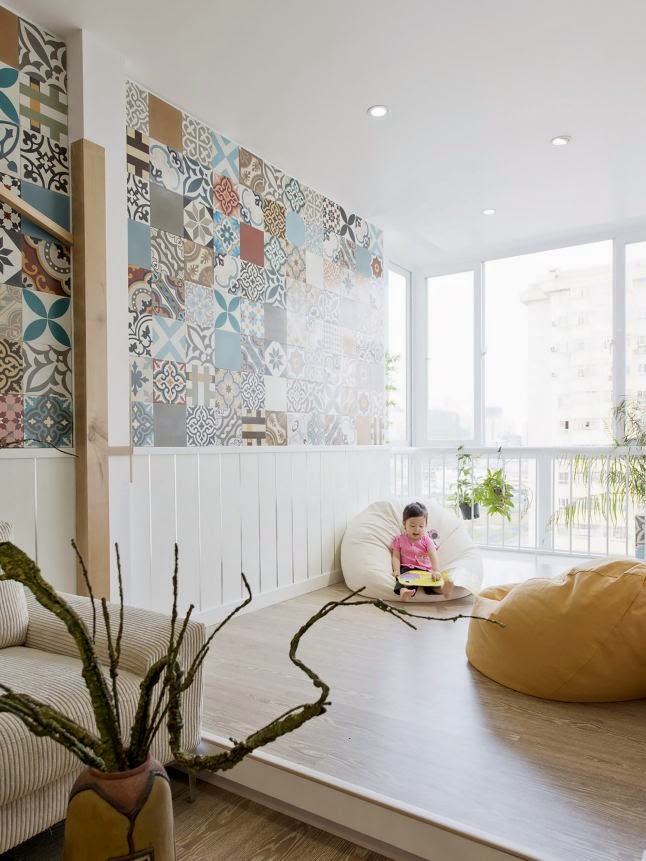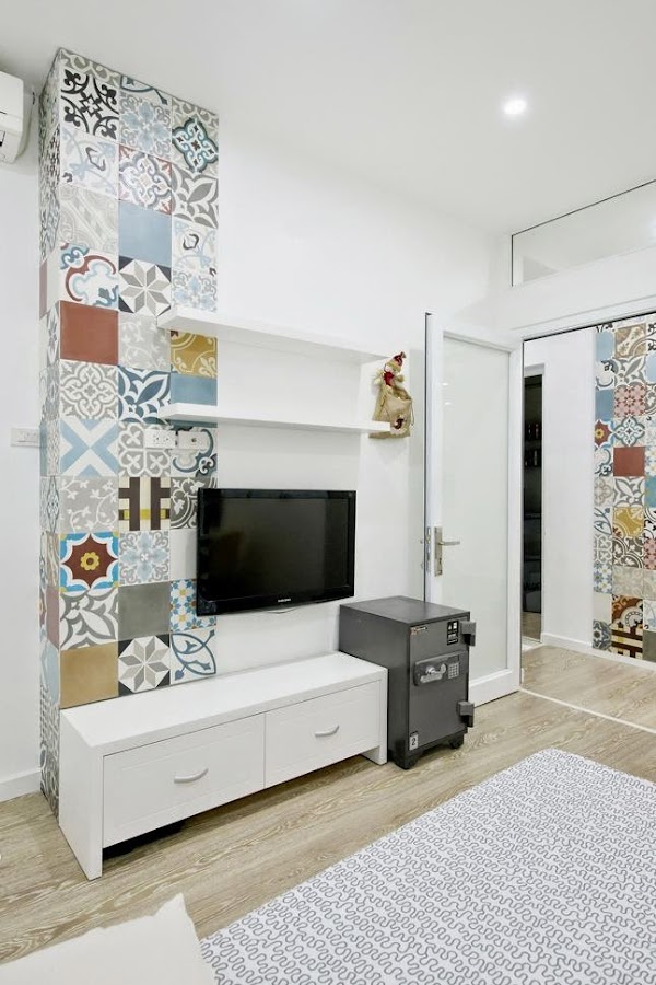 El uso de baldosas hidráulicas en interiorismo ofrece multitud de posibilidades en decoración, Aunque en sus inicios su utilización se sitúa en el mediterráneo, poco a poco se va convirtiendo en tendencia mundial, por su tacto y acabado artesanal, con unos patrones de dibujos en colores combinados con esmero, que da un toque especial a cualquier estancia. Habitualmente se colocan en el suelo, pero a veces también sirven como revestimiento de paredes, convirtiéndose en joyas decorativas, como en el caso de esta vivienda de Vietnam, en la que las baldosas hidráulicas se colocaron en practicamente todas las estancias, creando una atmósfera alegre y con cierto aire retro.
