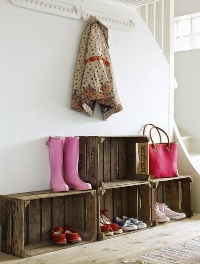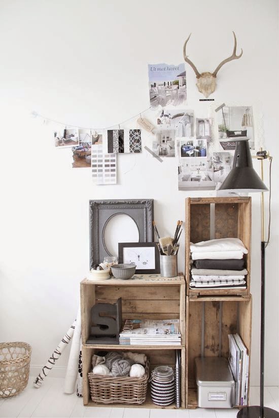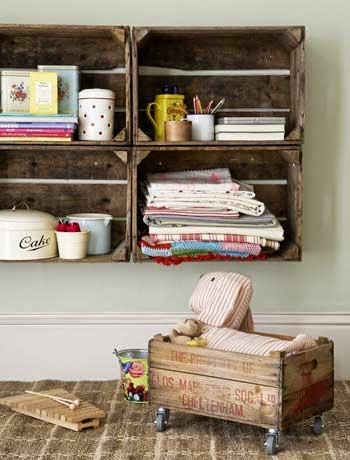 Tengo que reconocer que no había pensado mucho sobre este tema cuando decidí utilizar un par de cajas de fruta para la decoración de mi casa y solo me quedé en la opción de guardas cosas, pero viendo los ejemplos que he ido encontrando y que os enseño mas abajo veo que existen muchas posibilidades y todas con un resultado muy bueno. Como veis podéis emplearlas como separador de ambientes, que para mi gusto es una muy buena opción. También me ha gustado mucho la opción de poner varias cajas en un rincón, por ejemplo del salón, donde poner libros, cajitas decorativas, adornos, alguna foto...y crear así un rincón muy personalizado y sobre todo precioso como el que podéis ver en la tercera fotografía.