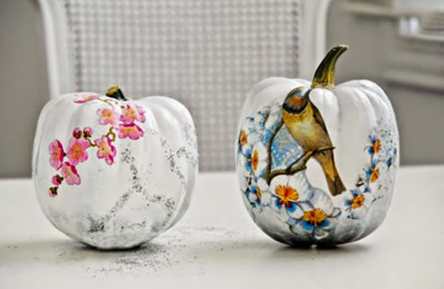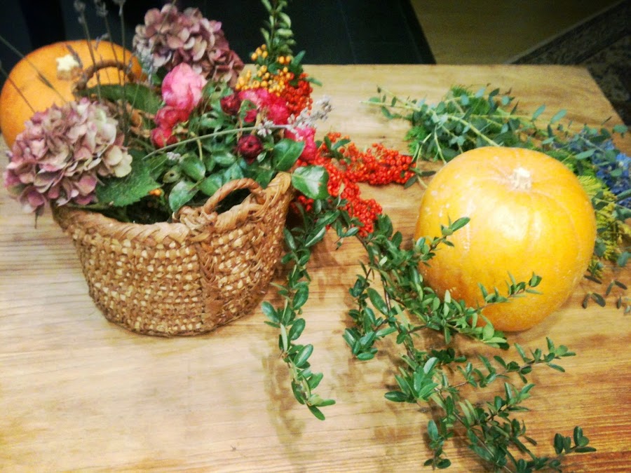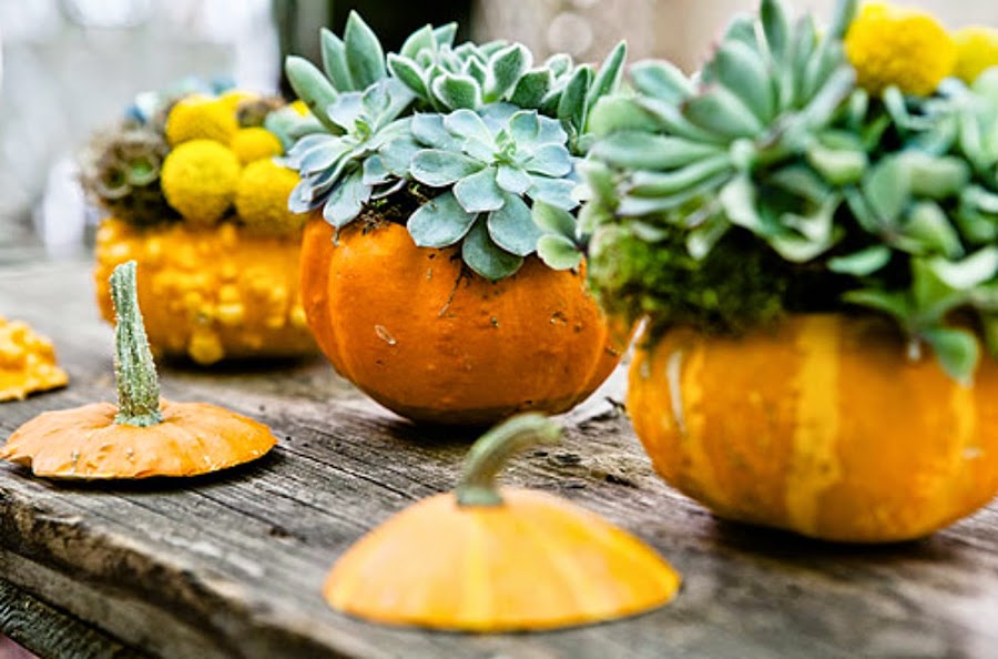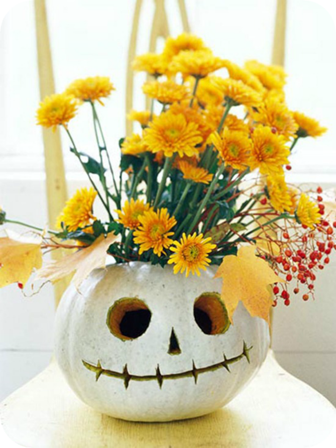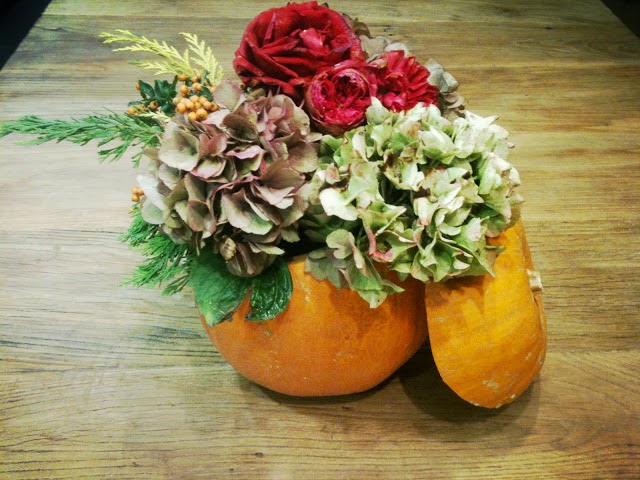 Empezamos con algo tan sencillo como coger una calabaza vacía y decorarla con las flores que más os gusten. Sí, sí, como si fuera un jarrón. Mirar que bien queda....