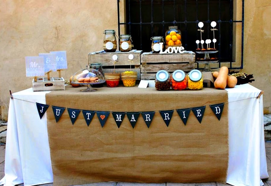 P.D. Os dejo foto de una de nuestras "Candy Bar" también muy otoñal... Tela de arpillera, cajas antiguas, "Love" y frutos en tonos de otoño... con tan poco se consigue un gran resultado. ¿No os parece?