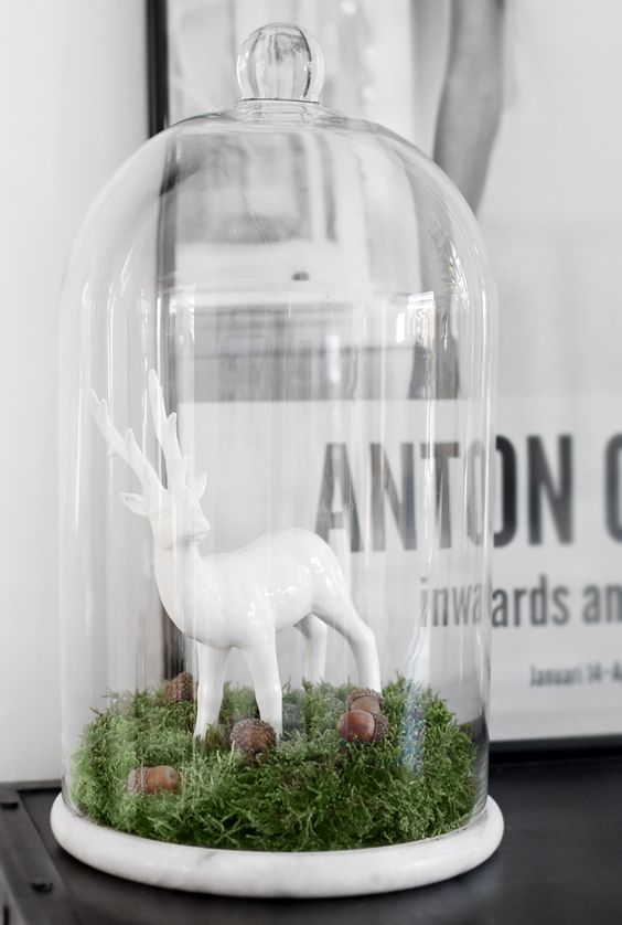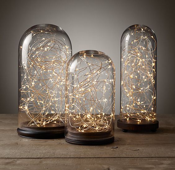 Como os comentaba, las campanas de cristal son ha día de hoy uno de los elementos decorativos que mas me gustan. Podéis ver en las imágenes que podemos colocar en su interior multitud de cosas, desde plantas hasta luces pasando por figuritas, prácticamente cualquier cosa que se nos ocurra y que queramos destacar. Y esta es una de las ventajas que mas me gusta de las campanas, nos pueden servir para destacar alguna pieza u objeto importante que tengamos en casa, además de protegerlo de cualquier daño exterior.