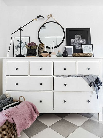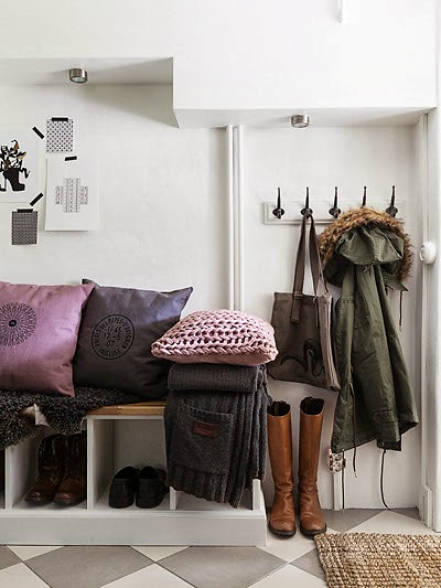 El color rosa palo este año esta entrando con fuerza dentro del ámbito de la decoración, y sobre todo si lo combinamos con gris, negro y blanco, el resultado es casi mágico. Prueba de ello es este inmenso hall decorado en blanco, gris y negro, con pequeñas pinceladas de color rosa palo y cuyo resultado en elegante sin caer en la cursilería. Además del acertado uso de los colores, llama mi atención el fantástico colgador de complementos en forma de botones.