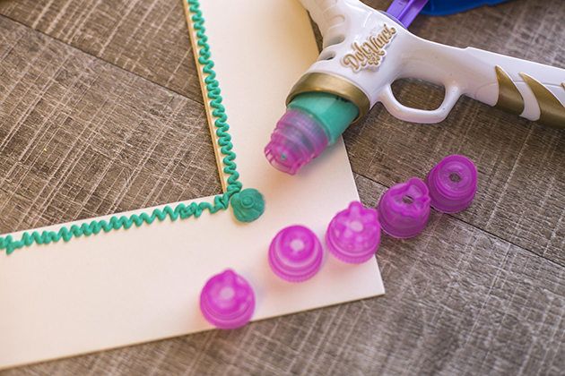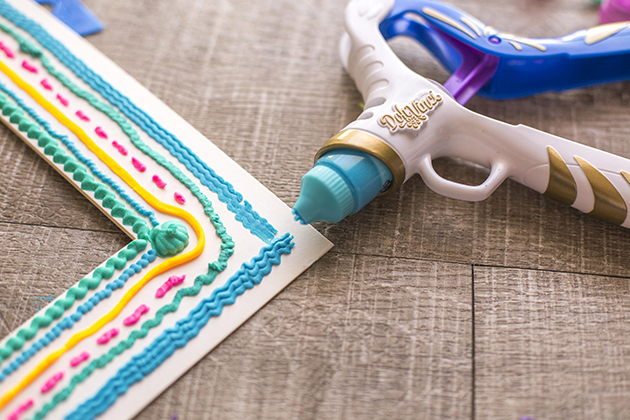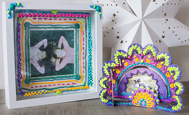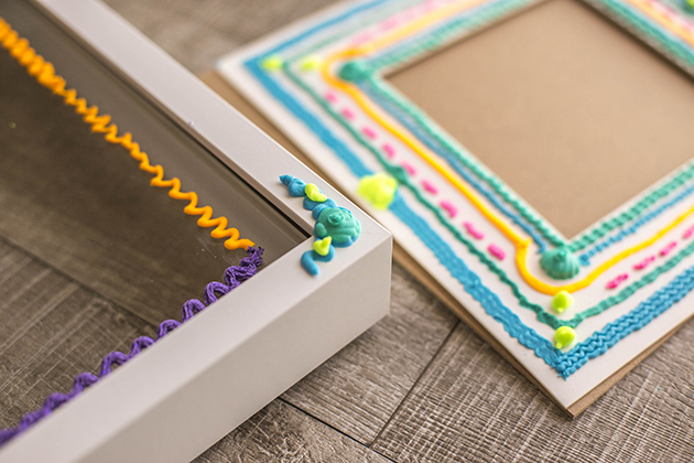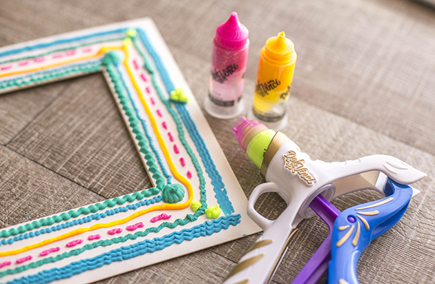 En uno de los formatos, te viene una pistola, con muchos accesorios para decorar, boquillas, colores y sellos. Mientras que en el otro a parte de los colores y la pistola te viene un accesorio para que tu decores, en mi caso, un bonito marco de fotos. A si que a parte de probar y empezar a jugar con este marco de fotos, después decidí decorar otro marco de fotos (de Ikea).