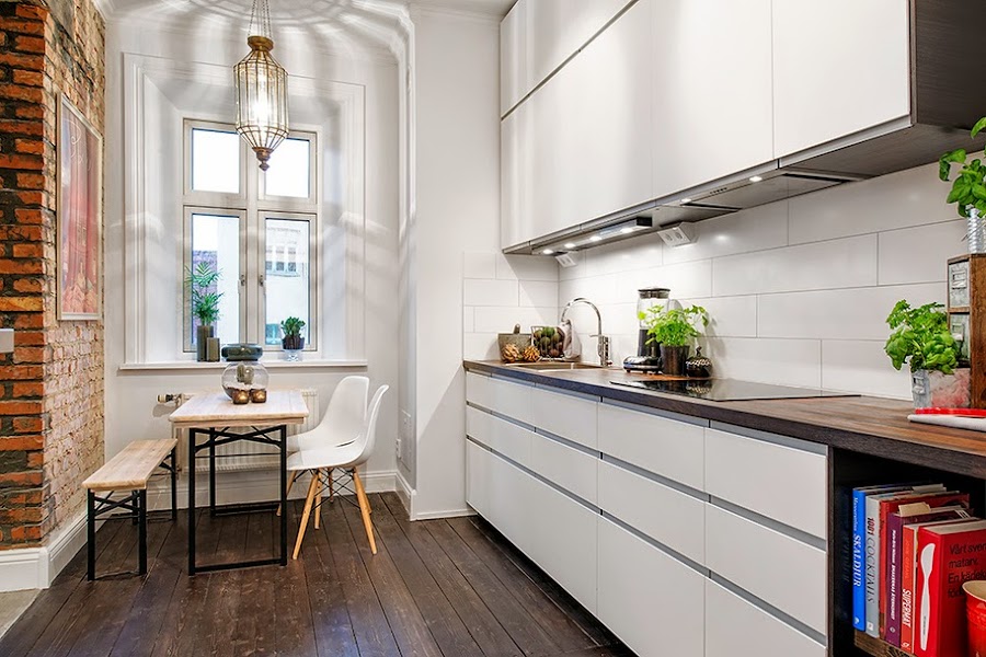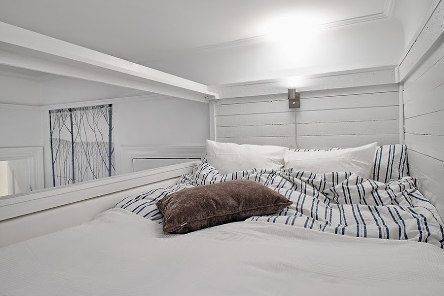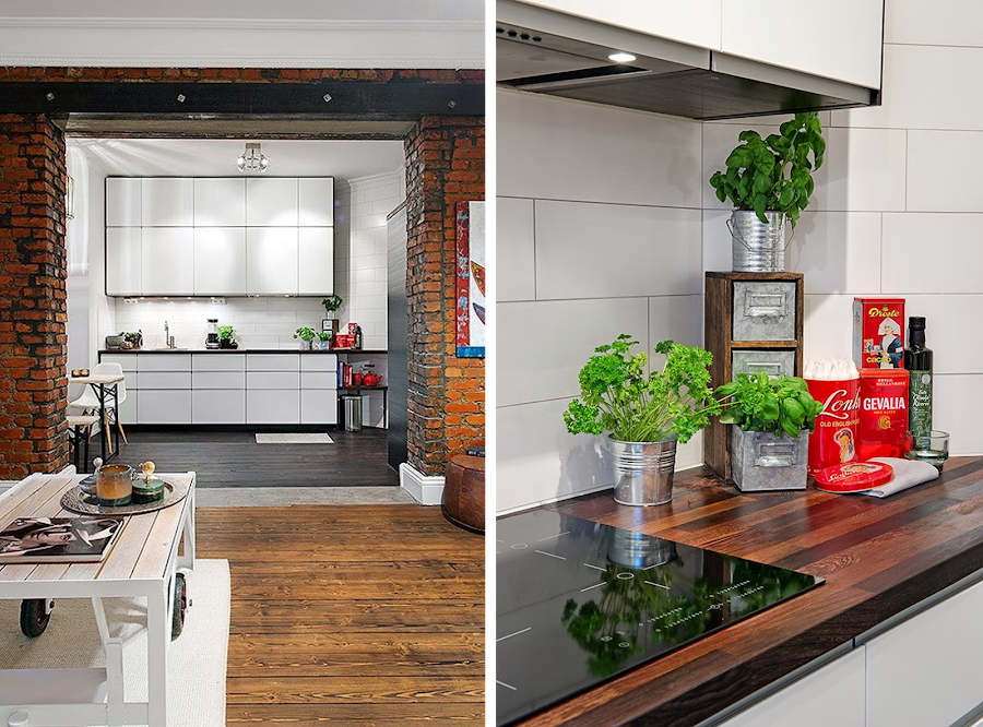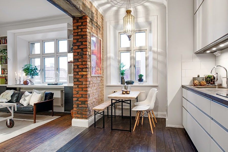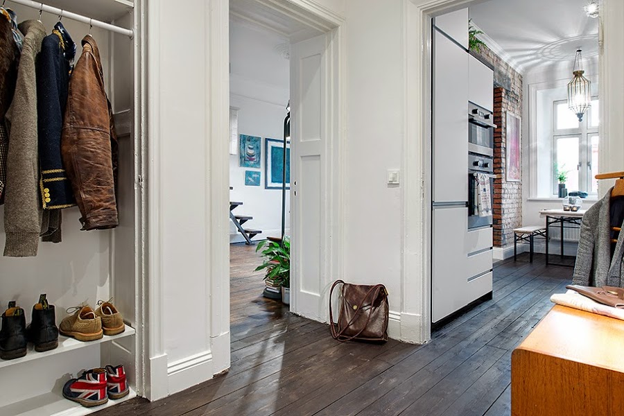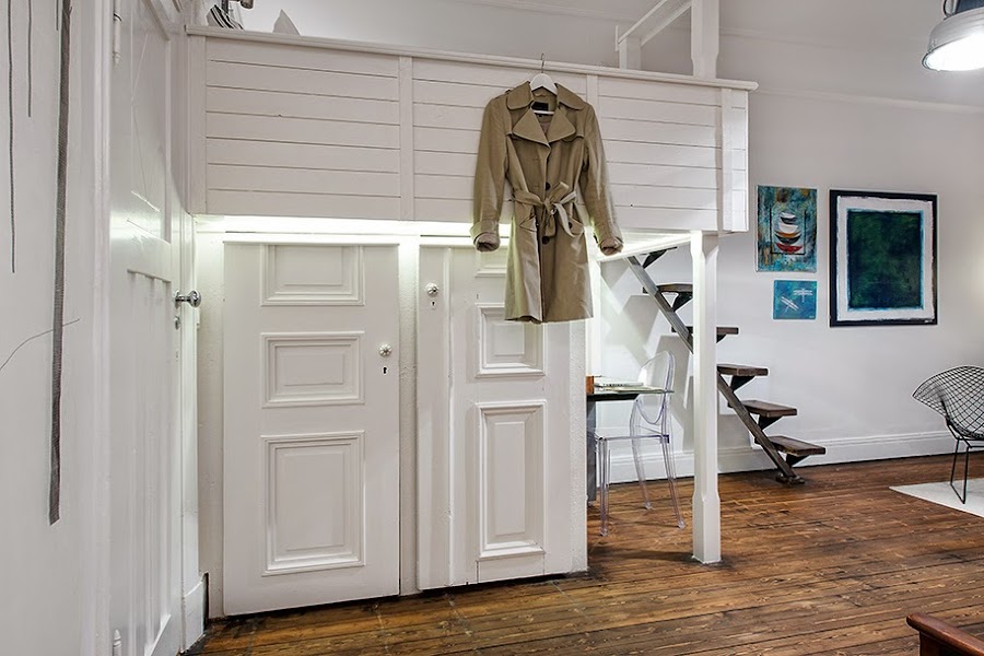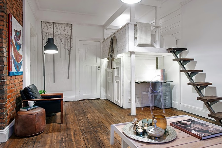 Hay en ocasiones, como en en este piso, de que los elementos arquitectónicos que soportan la estructura de la vivienda quedan a la vista y forman parte de la decoración. Ladrillos, vigas de acero y tornillos se convierten en elementos decorativos que contribuyen a dar carácter a la vivienda, dando un aire industrial a este apartamento de marcado estilo nórdico. El suelo de madera también cobra protagonismo con un tratamiento de envejecido y con la colocación de baldosas hidráulicas a modo de felpudo en la cocina. En cuanto a su distribución, la falta de metros cuadrados agudizó el ingenio de sus diseñadores, construyendo el dormitorio de matrimonio sobre un altillo, utilizando la parte inferior como espacio para grandes armarios.