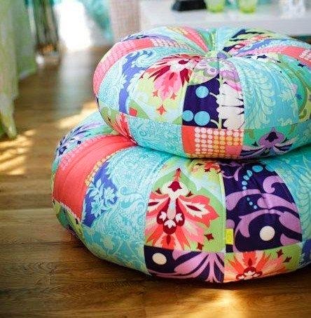 Los tonos rosas, rojos y anaranjados, con diseños en triángulo, rombos, etc... Puede alegrar cualquier rincón de tu habitación. En este caso las formas redondas son las mejores. Material: piel, tela o ganchillo.