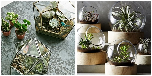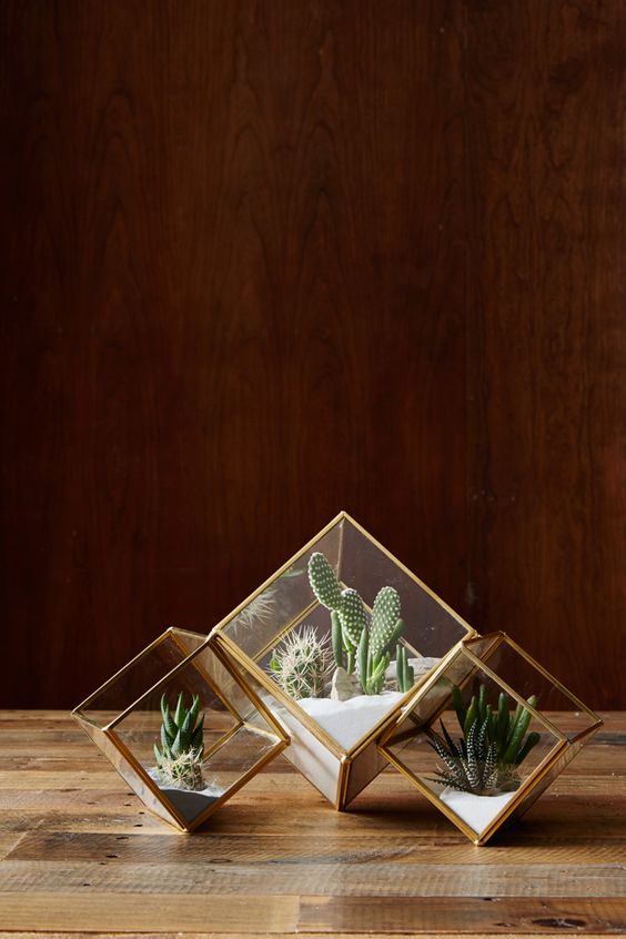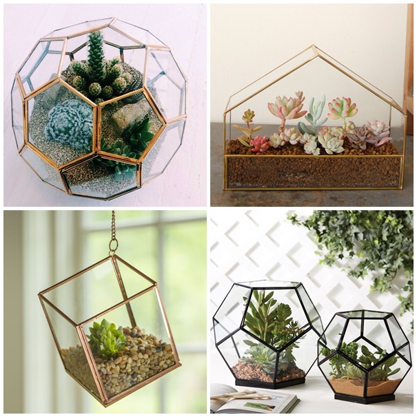 Son unas cajitas o bolitas de cristal, con forma, los hay de muchos tipos, en forma de diamante, redondos, cuadrados. Y dentro se plantan suculentas ¿No sabes lo que son suculentas? Pues una planta perfecta para las que no nos acordamos de regar jijiji, son plantas que van engrosando para almacenar agua y permiten aguantar largos periodos sin agua. Los cactus son los más conocidos pero hay muchísima variedad. Con solo estos dos materiales conseguimos un terrario, genial para poder colgarlo, o dejarlo simplemente como objeto decorativo sobre la mesa del recibidor o en cualquier rincón que necesite vida.