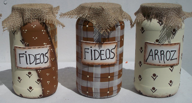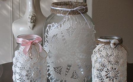 Primero, encontramos algunos ejemplos de cómo decorar frascos con géneros gruesos, con diseños y hasta con encajes.