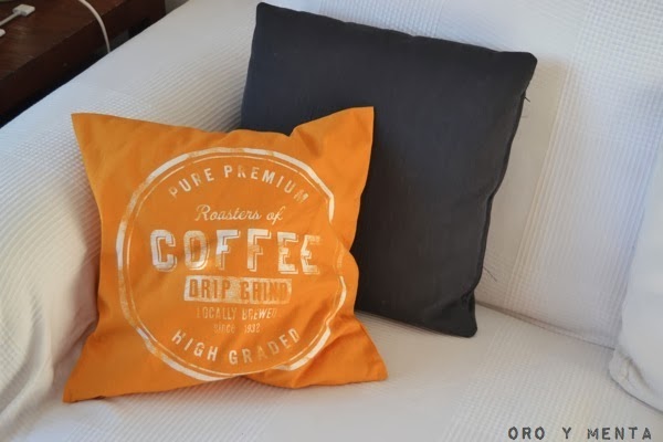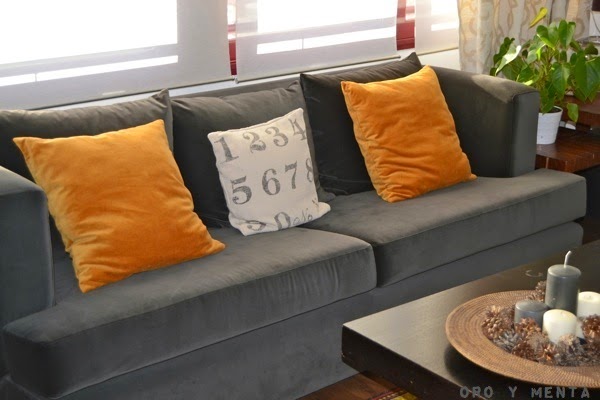 Así que aquí estoy hoy mostrando el resultado, que por ahora me gusta bastante, ya que contrasta con el gris del sofá. Por cierto que os cuento también un poco la historia de este sofá...que me costó un montón elegir y al final fui a una tapicería a que me copiaran un modelo que había visto en la revista Nuevo Estilo...tal cual. El otro cojin que véis en la foto, el de los números, es de Maisons du Monde.