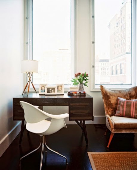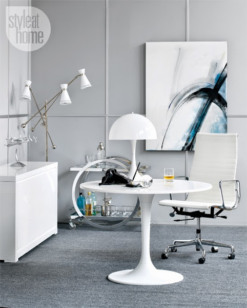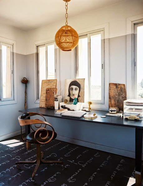 La elegancia del negro en el escritorio y la lámpara tan original,