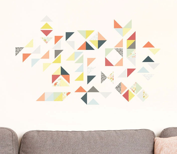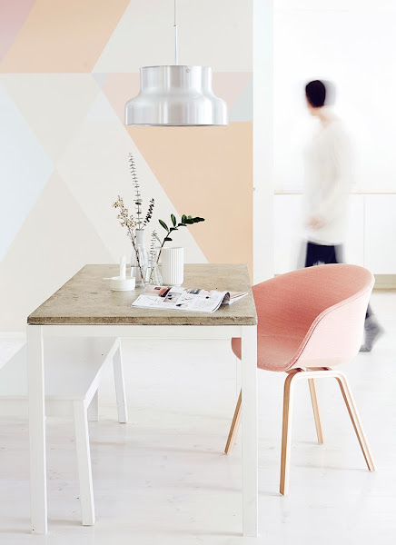 Y aquí mi opción favorita, es algo más entretenido de realizar que la anterior, pero el resultado es mucho mejor ya que consiste en pintar directamente sobre la pared, ya sea con rodillo o con pintura en spray. Para ello sólo tendremos que hacer la plantilla con cinta de pintor sobre la pared y rellenar huecos! Si además elegimos tonalidades pastel el resultado puede ser tan bonito como este.