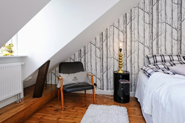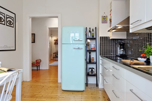 En el salón, un sofá azul decorado con cojines de colores vivos es la pieza central , pero además tiene otros muchos detalles que le aportan un carácter especial, como la "lámpara bola del mundo" o la fantástica "lámpara de la abuela" en amarillo, detalle que se repite en la zona del comedor y que contrasta con la modernidad del vinilo urbano que ocupa toda la pared.