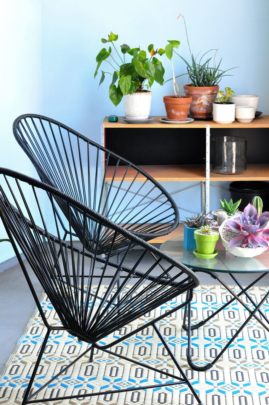 TERRAZA. Y por último la terraza, en la que no podían faltar este tipo de piezas, en este caso un par de sillas ACAPULCO en color negro y muchas plantas, como también las hay por el resto de la vivienda.
