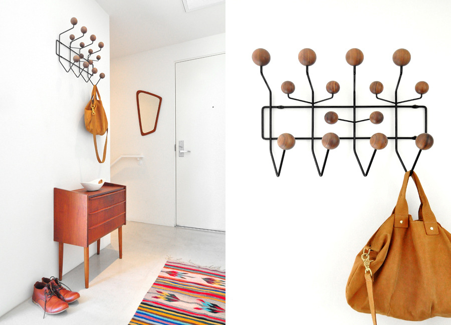 ENTRADA. El perchero de los Eames es el protagonista, con acabado en madera y colocado sobre una cómoda de estilo retro, como el resto de mobiliario de la vivienda. El toque de color lo aporta la alfombra de estilo navajo.